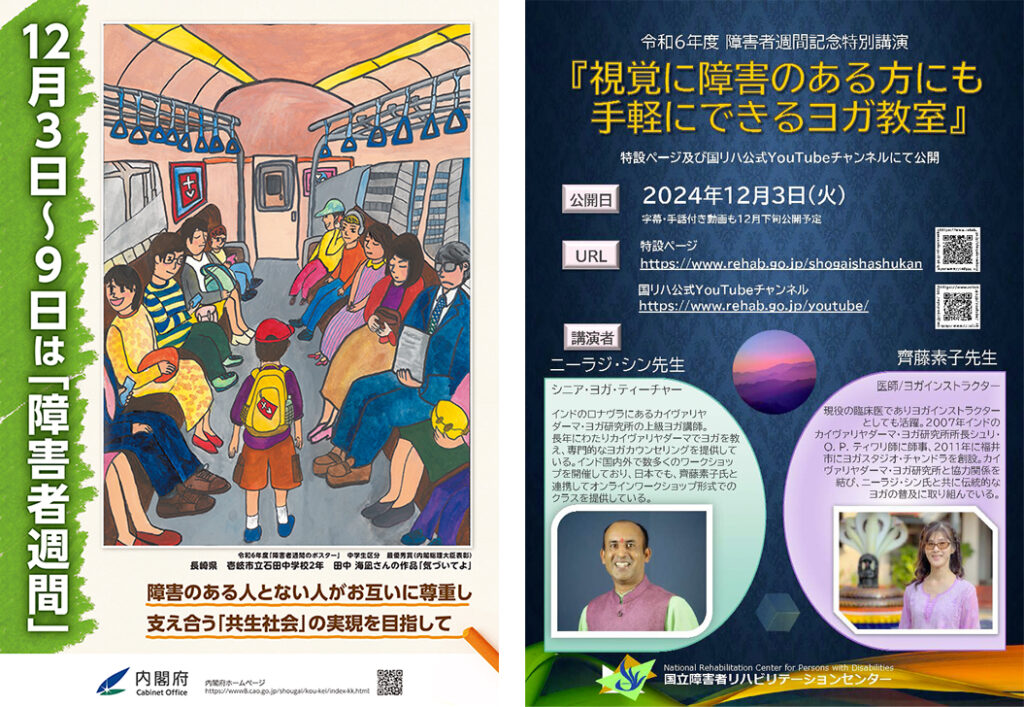 たとえば、内閣府では障害者週間のポスター・標語コンクール表彰式、シンポジウム、パネル展示などの啓発イベントを行っています。国立障害者リハビリテーションセンター(東京都狭山市)では、障害者週間記念事業としてシンポジウムや展示会が実施され、2024年はヨガ教室が開催されました。