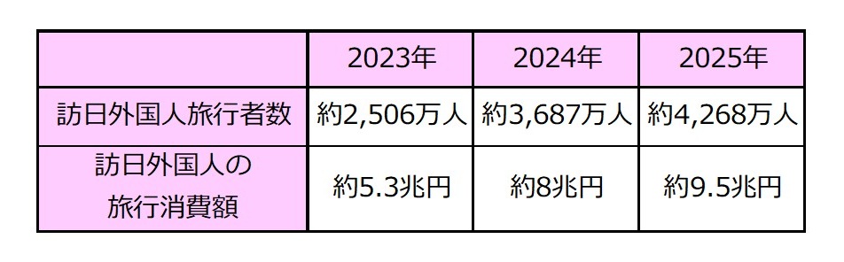 2025年の訪日外国人旅行者数は、速報値で過去最高の4,200万人を突破し、旅行消費額も9兆4,559億円といずれも過去最高を記録 (※1 ※2)しました。