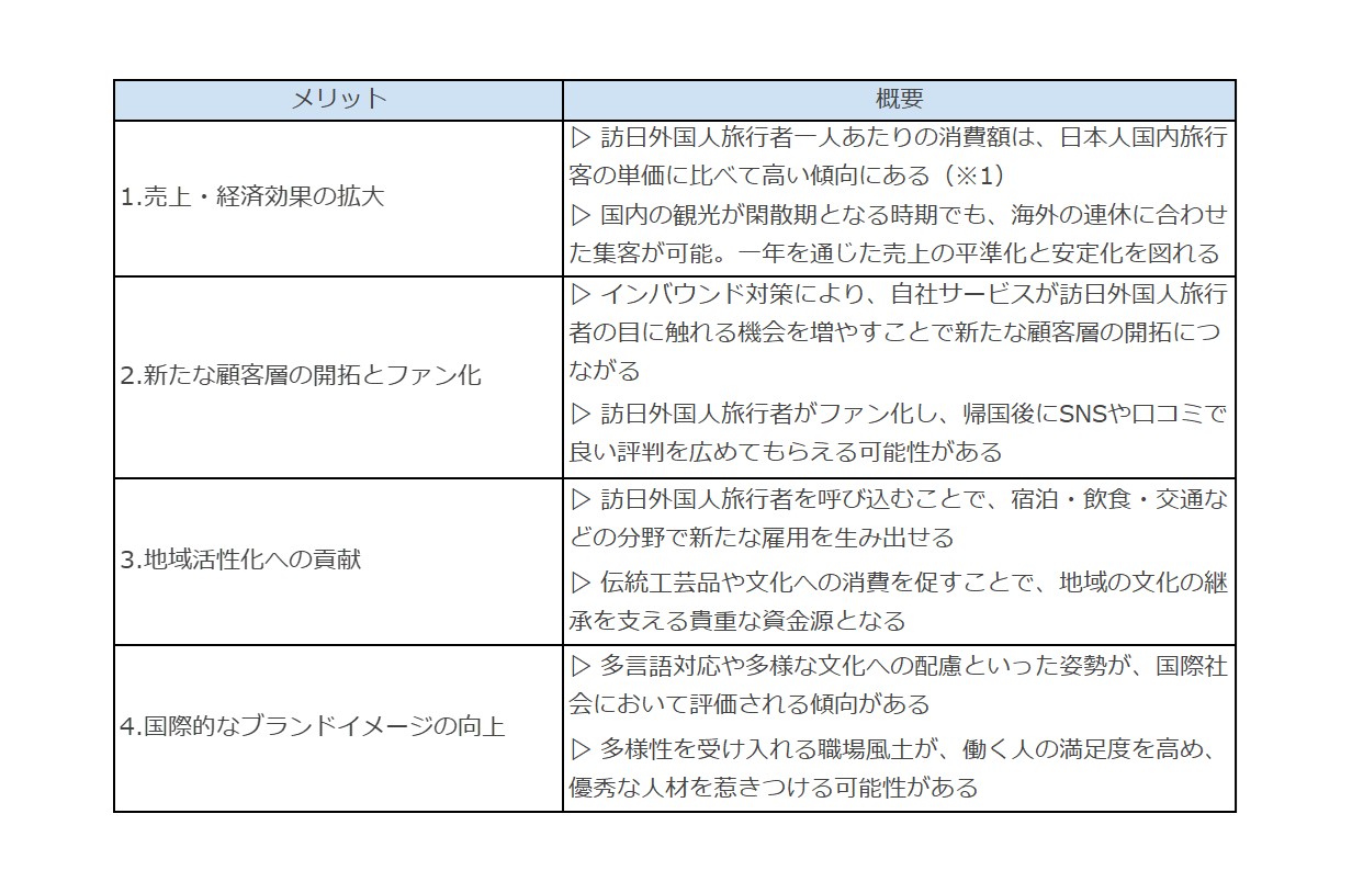 インバウンド対策に取り組むことで得られるメリットの例は、下記のとおりです。