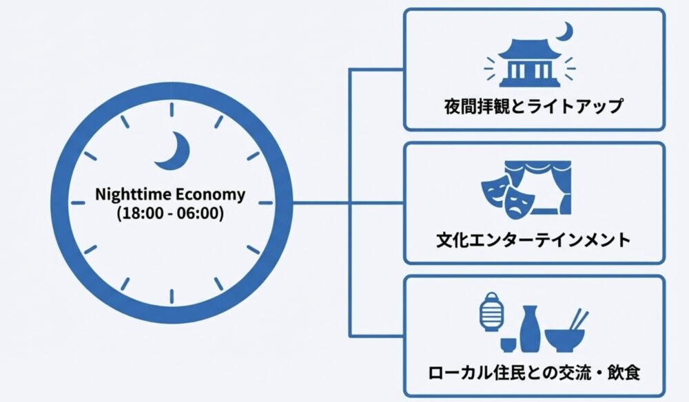 夜間の経済活動である「ナイトタイムエコノミー」を充実させることで、旅行客がその地域に宿泊するきっかけとなり、一人あたりの消費額を大きく増やすことができます。