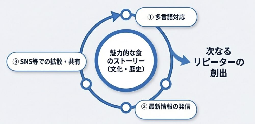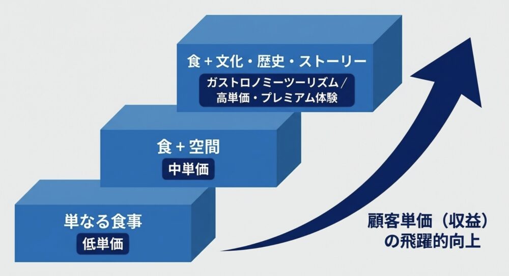単においしいものを食べるだけでなく、食材の背景や歴史に触れる特別な体験(コト消費)を求める昨今の旅行客のニーズをつかむ考え方です。