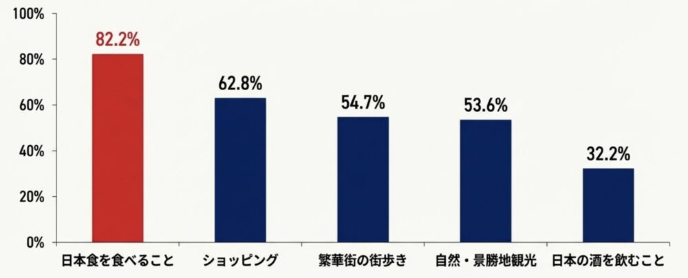 国土交通省の調査で「訪日前に期待していたこと」を複数回答で尋ねたところ、「日本食を食べること」が82.2%と最多。