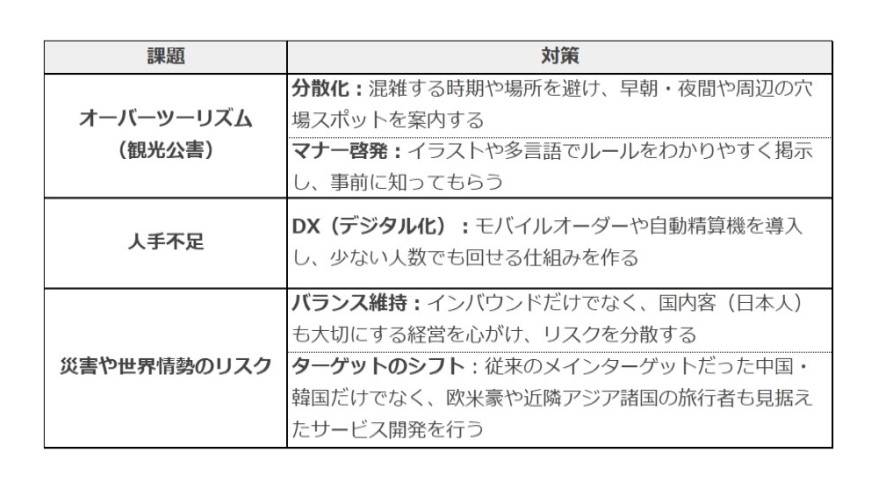 インバウンド需要拡大により生まれた課題に対して、企業や自治体はどのように向き合えば良いのでしょうか。まず試したい対策は下記のとおりです。